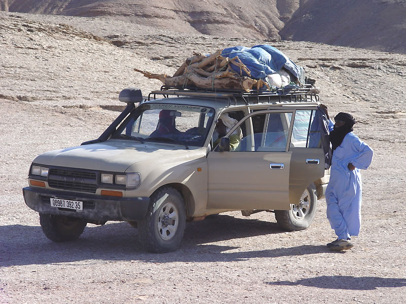 Ensuite en route pour la Tadrart (massif montagneux à 200km de pistes de Djanet). La voiture est chargée pour une semaine: bois, eau, vivres et bagages. Nous sommes pris en charge par 3 personnes: un conducteur (Saad), un cuisinier (Abdel Kader) et un guide (Abdelah).Previous | Home | Next |