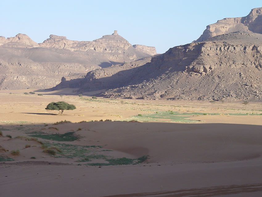 Nous sommes arrivés dans la Tadrart. Nous allons suivre un oued qui s'appelle In Djaren. Cet été il a plu ce qui n'était pas arrivé de puis au moins 5 ans, nous découvrons donc les paysages avec un peu de verdure dans le fond des vallées. (Abdellah a essayé de nous faire croire que le bloc cubique en haut de la montagne était un château d'eau... nous ne l'avons pas cru)Previous | Home | Next |