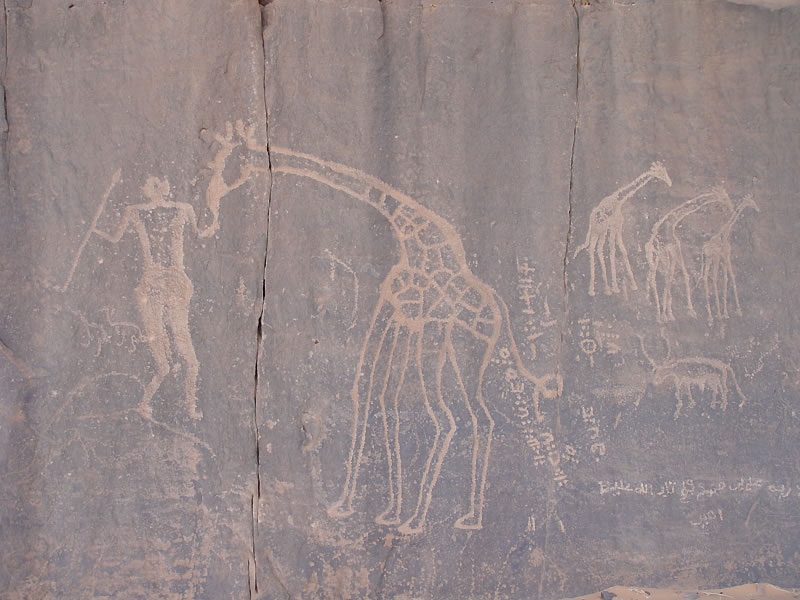 Une girafe tenue par un homme, avaient-elles été domestiquées? C'est ce que se demandent les spécialistes. On voit aussi des inscriptions en Tifinar, caractères touaregs. Mais elles n'ont "que" un millier d'années.