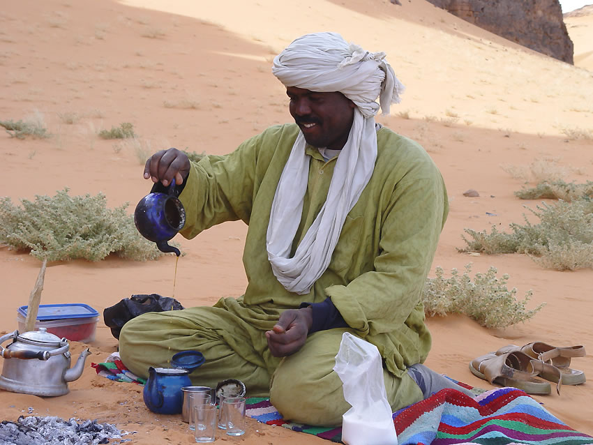 Saad est aujourd'hui responsable de la préparation rituelle du thé. Trois fois par jour (minimum) les touaregs préparent du thé très sucré. Il faut en boire 3 verres : le premier est amer comme la vie, le second fort comme l'amour et le troisième doux comme la mort.Previous | Home | Next |