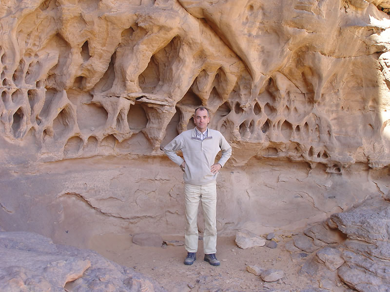 Louis devant des formes curieuses creusées dans la roche. On croirait de grosses alvéoles.