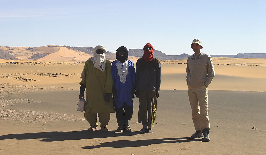 Nous sommes sortis de la Tadrart et nous retrouvons le sable noir. Photo de notre équipe: au fil du voyage, un réel esprit de complicité est né...