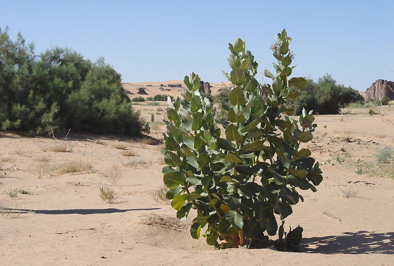 Végétation rencontrée: Caliotropis (au premier plan) ou pommier du Soudan, et Tamaris (au second plan)