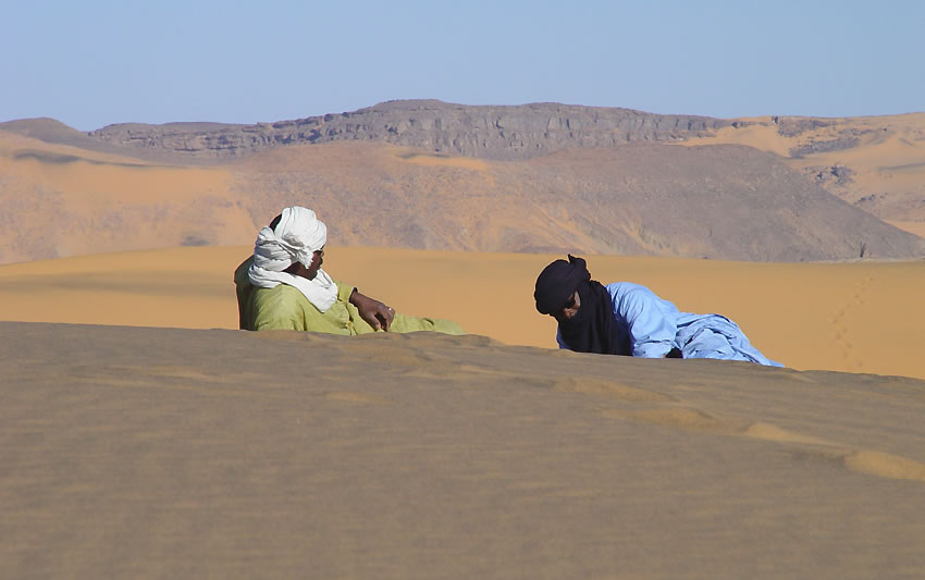 Nouvelle pause. Découverte de petites dunes jaunes recouvertes de sable noir. Saad (cheich blanc) et Abdellah (cheich bleu indigo) se reposent un peu.