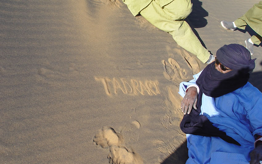 Le massif montagneux de la Tadrart se rapproche, il est le centre de nos discutions. Le sable est merveilleusement fin et propre...