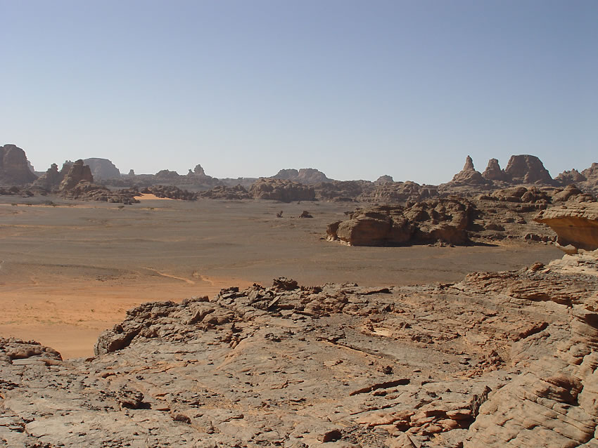 En quittant notre vallée d'In Djaren, nouveau paysage, la roche est noire et le paysage désolé.