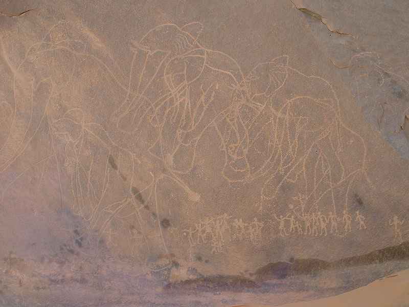 Troupeau d'éléphants entouré de personnages.